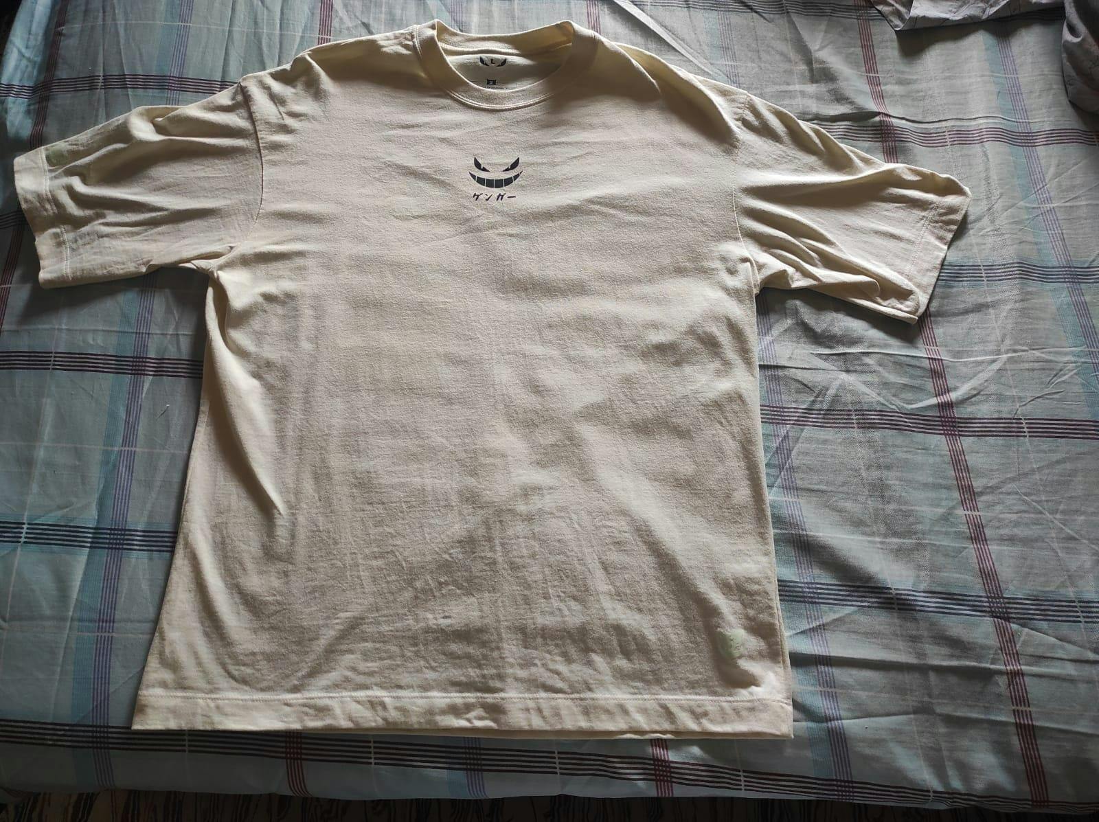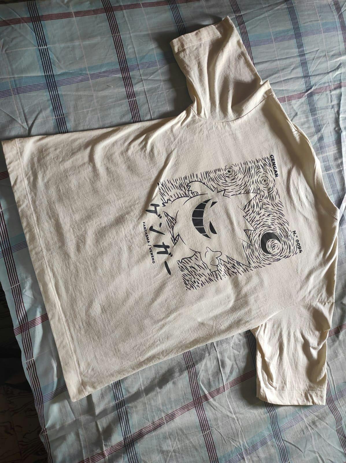 El estampado en la parte trasera combina la técnica de La noche estrellada de Van Gogh con Gengar, Además, tiene un detalle en la manga derecha que brilla en la oscuridad, lo que lo hace súper especial. Y en la parte delantera, la sonrisa característica de Gengar es simplemente genial, le da un toque único al diseño.